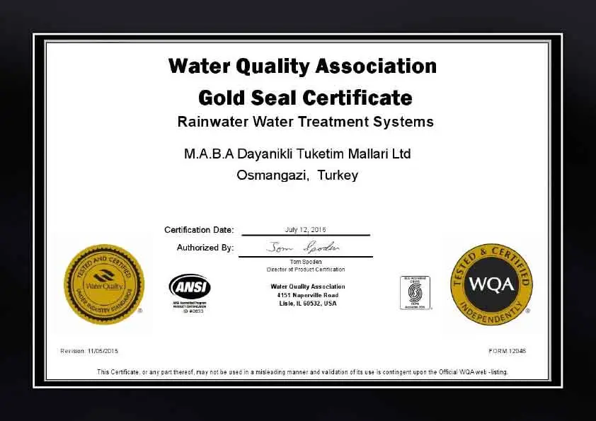 The Water Quality Assoction Gold Seal programı 1959’dan beri belirlediği standartlar ve testler sonucunda içme suyu konusunda ürünleri sertifikalandırmaktadır. WQA su arıtma sektöründe bağımsız sertifikalandırma konusunda dünyanın en saygın ve güvenilir kurumudur.