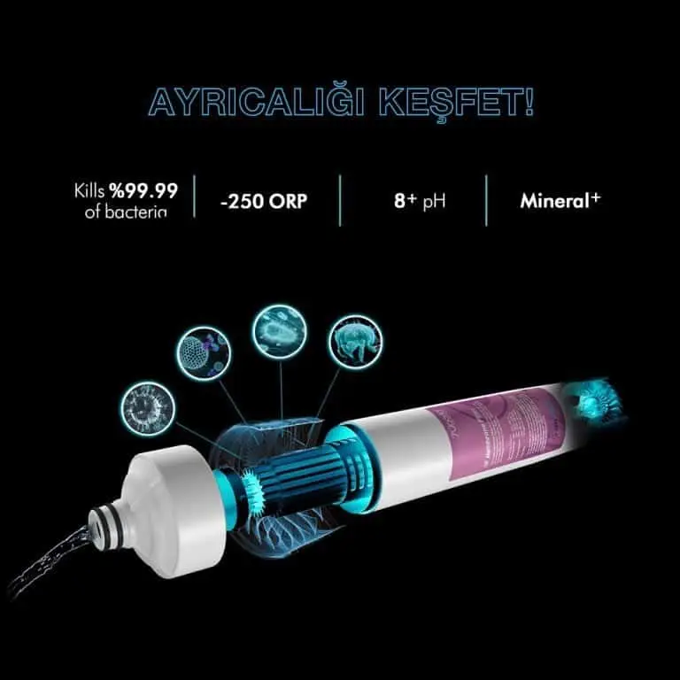 Filtre Sistemi: Cihaz, dört aşamalı bir filtreleme sistemine sahiptir. Bu aşamalar: tortu filtresi, ön karbon filtresi, alkali filtre ve son olarak ikinci bir tortu filtresidir. Bu kapsamlı sistem, suyunuzun en yüksek kalitede arıtılmasını sağlar.
