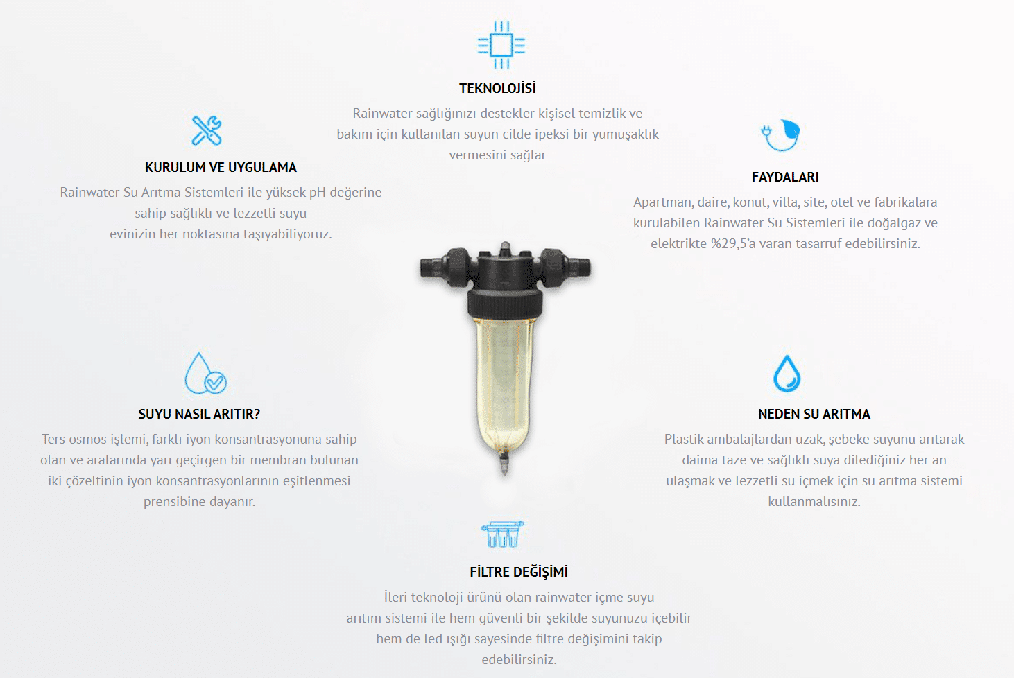 Ankara Arıtma olarak, ev ve işyerleriniz için en kaliteli su arıtma çözümlerini sunuyoruz. Rainwater markası ile geniş ürün yelpazemizde tezgah altı su arıtma cihazları, hidrojenli su arıtma sistemleri, duvar ve yer tipi su sebilleri, su ısıtıcı soğutucular ve filtre çeşitleri bulunmaktadır.