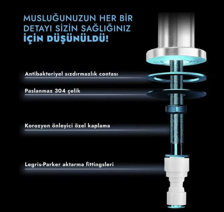 Musluk ve Bataryalar: 2’li ve 3’lü musluk seçenekleriyle arıtılmış suyunuzu ergonomik ve şık tasarımlı musluklar ile kullanın. Paslanmaz çelik ve krom kaplama seçeneklerimiz mevcuttur.